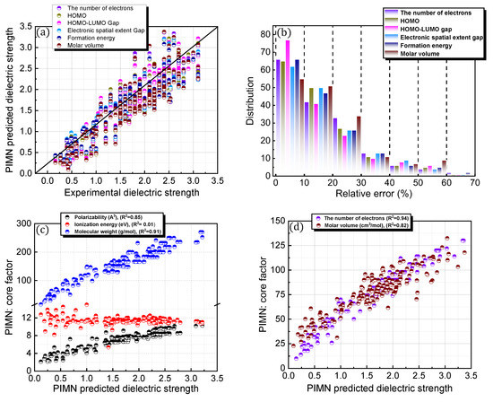 It is interesting to consider whether an equation-based protocol can be developed by combining factors that are highly correlated with dielectric strength (i.e., Equation (4)). Accordingly, the impact of this distinct protocol design on the prediction accuracy was explored (Figure 6; Table 1). To achieve this goal, chemical (i.e., formation energy, polarizability, ionization energy, the number of electrons, HOMO, HOMO–LUMO gap, and electronic spatial extent gap) and physical (i.e., molecular weight and molar volume) descriptors were further investigated for the 168 PFC and non-PFC compounds (Figure S3). The chemical descriptors were computed by the DFT method. For instance, the formation energy, which is defined as the energy required for the formation of a compound from its elemental constituents, was predicted by the DFT-calculated energies of the compound and its elemental constituents. The DFT-calculated frontier orbital analyses were employed for HOMO and LUMO values, while the DFT computation of the dipole-based electric field was used for polarizability. The DFT-calculated energy change associated with oxidation was utilized for ionization energy. The electronic spatial extent gap is a measure of how widely the electronic density is distributed within a molecule. It reveals the average distance between the electrons and the nucleus in a molecule, providing insight into its electronic structure and properties. The electronic spatial extent gap of a molecule was computed by , where represents the electron wave function of the molecule, is the distance between an electron and its molecular center, and is a 3D element of space, in other words, the integration of and over three-dimensional space. Direct correlations of these descriptors with experimental dielectric strength were further analyzed for the 168 PFC and non-PFC compounds (Figure S3). As seen in the figures, the correlation degree depends on the introduced descriptor. Consequently, five distinct factors (polarizability, the number of electrons, MW, formation energy, and molar volume) were chosen as the most highly ranked factors in terms of correlation with dielectric strength (Figure S3). Notably, the IE, which is a main contributor in the original PIM protocol, as well as crucial core factors, such as the HOMO–LUMO gap and HOMO, were excluded from this equation-based protocol in PIMN. Unexpectedly, the parameterization of the developed equation-based protocol resulted in a deterioration in prediction accuracy (relative error = 17.70%; RMSD = 0.340) compared with PIMN (via HOMO–LUMO gap and HOMO) (Figure 7a,b). This result implies that the synergistic effect of appropriately selected core factors, such as polarizability, IE, MW, and HOMO–LUMO gap, is more impactful for predicting dielectric strength than the correlating ability of an individual factor.