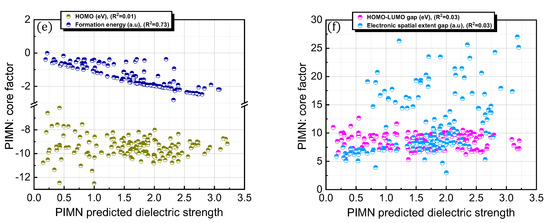 First, the original core factors (polarizability, IE, and MW) were correlated with the predicted dielectric strengths of the 168 PFC and non-PFC compounds (Figure 3d, Figure 4c and Figure 5c; Table 2). Two of these core factors (i.e., polarizability and MW) exhibited linear correlations with the PIM-/re-PIM-/PIMN-predicted dielectric strengths (R2 > 0.8). It should be noted that the R2 value describes the degree of deviation of a data set from a linear regression line. Thus, a compound with a higher polarizability or IE would have a higher dielectric strength. In contrast, the IE was maintained within a range of 8–14 eV for all the compounds, indicating that the dielectric strength is insensitive to this core factor. This observation also highlights that the IE should be within the aforementioned range regardless of the type of compound, which is a key condition for achieving reliable dielectric strength predications. This may account for the unexpected decrease in the accuracy of the dielectric strength prediction with the OPT, which did not include the IE as a core factor, as compared to PIMN (via HOMO–LUMO gap).