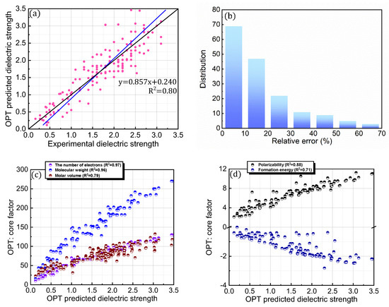 (a) Comparison of OPT-predicted and experimental dielectric strengths for 168 PFC and non-PFC compounds. (b) Distribution of relative errors for OPT-predicted dielectric strengths. (c,d) OPT-predicted dielectric strengths described as functions of the core factors (number of electrons, molecular weight, molar volume, polarizability, and formation energy).