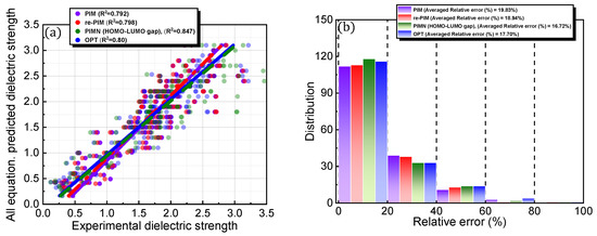 (a) Comparison of PIM-, re-PIM-, PIMN-, and OPT-predicted dielectric strengths with experimental dielectric strengths and (b) distributions of their relative errors. In (b), the distribution for each prediction protocol has blocks of 0–10, 10–20, 20–30, 30–40, 40–50, 50–60, and 60–70.