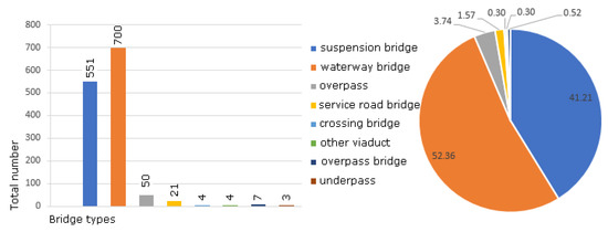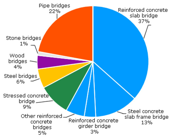 Most bridges in Finland are either state or municipalities owned and, in some cases, may be owned by companies or road councils. The Finnish Transport Infrastructure Agency acts as the owner of the bridges under it [28]. It is responsible for the development of the bridges in cooperation with the Finnish Railways Agency. Although not all bridges are state-owned and therefore under the control of the Finnish Railways Agency, many are designed and built according to the guidelines of the Norwegian Railways Authority. According to the skill structure record, a total of 22,118 bridges are used in Finland (8 November 2022), of which 18,001 are owned by the Norwegian Railways Authority [44]. However, the total number of bridges, private roads, and municipal bridges in Finland must also be taken into account, and not all are registered in the skill structure register. The number of private road bridges is estimated to be around 12,000. The distribution of bridges in Finland can be represented by bridge types, construction materials, and status levels. Figure 1 shows the different bridge percentages of the numbers at the end of 2021 [28]. According to the distribution below, it can be stated that concrete is a dominant building material in bridges.