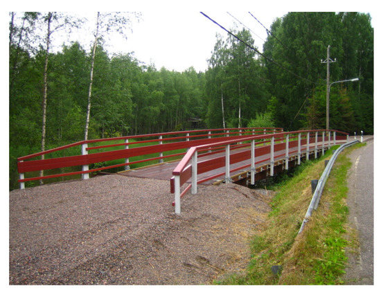 There are several types of wooden bridges used in Finland, but the most common among them are beam or girder bridges (Figure 3). Compared to the total number of bridges, the number of wooden bridges is very small. In Finland, the Ministry of Transport and Communications instructed the increase in the use of wood in infrastructure in 2018 (10% by 2022, excluding railway bridges) [45]. The popularity of building wooden bridges is due to recent purchasing procedure practices and general attitudes toward timber construction over the past decade. The client’s biases and lack of design expertise were reported as obstacles to the construction of the wooden bridge [46].