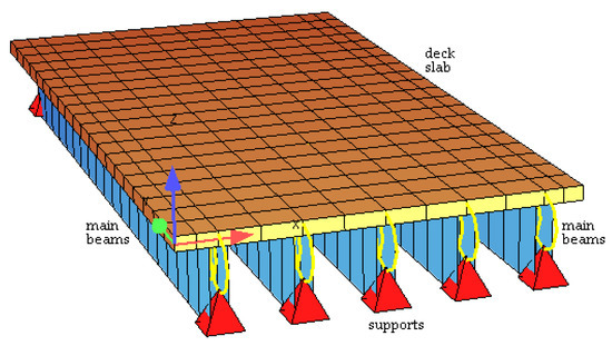 In the example presented, the focus was on the superstructure; in this case, the purpose of the dimensioning was the glued main beams and deck structure. A structural model of the bridge structure SOFiSTiK program [81] was created to determine the most critical stresses (Figure 5).