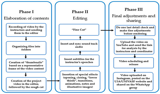 The video recording and editing procedures were carried out in three phases, presented in a flowchart (Figure 1). Phase I consisted of preparing the contents. Afterwards, the videos were recorded by the instructors in their homes and sent via a link to the responsible editor, who organized the files into folders related to the types of content (physical exercises or dynamics related to mental health). After the first phase, the raw video files were imported into a video editor program. In phase II, the audio was improved, a free soundtrack was added to the video, and subtitles and animations were included to make the material more enlightening for older adults. In phase III, the final adjustments were made, and the videos were shared via the YouTube channel, the U3A/UNIVASF website http://unati.univasf.edu.br/ (accessed on 5 March 2023), and WhatsApp groups.