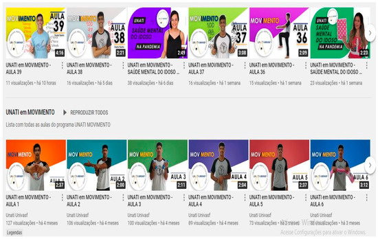 Figure 2 presents a set of images of the videos on physical exercise and psychosocial dynamics offered on the YouTube platform weekly to the older adult population. Overall, over 12 months, 69 videos related to exercise were made available, and 18 other videos in the field of mental health.