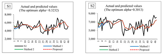 Figure 4 illustrates the actual and predicted values when setting the initial value using Method 1, Method 2, and the proposed method. For example, in S1, when setting the initial value using Method 2 and the proposed method, similar predicted values are achieved, but when setting the initial value using Method 1, the predicted values in the early period are far from those of the other methods. Additionally, they can be interpreted in the same way in the other time series. Moreover, Table 4 reports the lowest MSE values for the three initial value setting methods used to obtain the optimal value for α using the step search method and Solver from Microsoft Excel. For each dataset, the lowest MSE value was obtained from a set of 1000 MSE values. For example, for S1, when setting the initial value using Method 1, Method 2, and the proposed method, the lowest MSE values were 896,212.77, 886,047.38, and 885,070.96, respectively. This trend was the same for the other datasets. It can be seen that although the results are similar, setting the initial value using the proposed method obtained lower MSE values than the other methods. Figure 5 visually supports these findings.