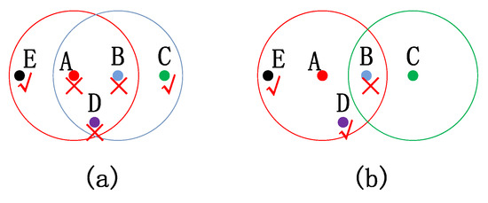 By comparing Algorithm 5 with Algorithm 7, we can see that both algorithms set the same initial conditions. Lines 5–7 in the Dijkstra Algorithm are used to set a termination condition, while Algorithm 7 does not. However, as the sensor network keeps working, it can be treated that the algorithm will loop forever, exceeding the time needed for convergence, and thus a termination condition is unnecessary. Then, in Algorithm 7, will not change when b because the node cannot find a shorter path; the same thing happens in the Dijkstra Algorithm. In the Dijkstra Algorithm, we update with , which is currently not in S while having the shortest path to s, as in Lines 9–13. Even though may change in Lines 5–10, it will finally be updated in Lines 11–15, following the same operation in the Dijkstra Algorithm. Thus, the two algorithms are equivalent at this stage, except that for Dijkstra’s Algorithm, nodes need to know the whole graph, while our algorithm can work only based on local information. As a result, with the forwarding guide, the sensor network can finally converge to the state where message packets can be relayed to the base station with the shortest expected wait.