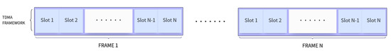 TDMA framework. Time is divided into a sequence of frames, with each frame further scattered into a set of slots.