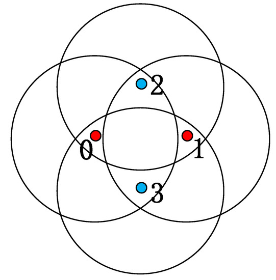 then we call Node k the second-order neighbor of Node i. Intuitively, a second-order neighbor represents a neighbor’s neighbor. Note that the neighbor relationship is defined based on the relative position of nodes. If the nodes’ positions change, the neighbor relationship may also change. In the following sections, variables defined for first-order neighbors are indicated with subscript and for second-order neighbors with subscript . The subscript indicates variables with both first-order neighbors and second-order neighbors. The definition of the neighborhood is shown in Figure 2.