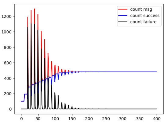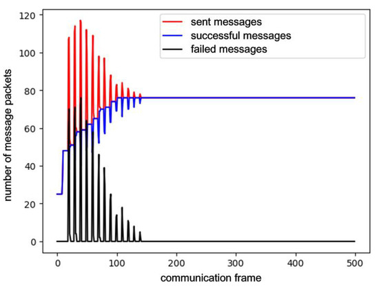 The performance of the method is shown in Figure 8, which shows the communication results in each frame with the number of successes and failures shown. The pulse in the figure indicates nodes trying to occupy slots, which may introduce collisions into the network. However, as time goes on, most nodes have already occupied optimum slots, and the deployment of pheromone clues prohibits nodes from occupying more slots. Finally, the network converges to the state without communication collision.