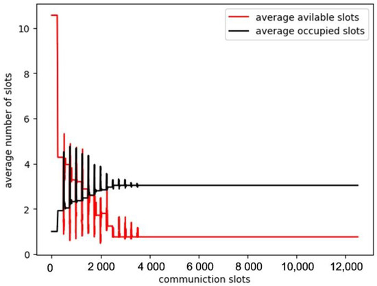 The average number of slots occupied by nodes over time. For each node, its available slots denote the communication slots not occupied by any of the node’s first-order or second-order neighbors. The average available slots represent the average number of all nodes’ available slots, and the average occupied slots denote the average number of available slots occupied by nodes.