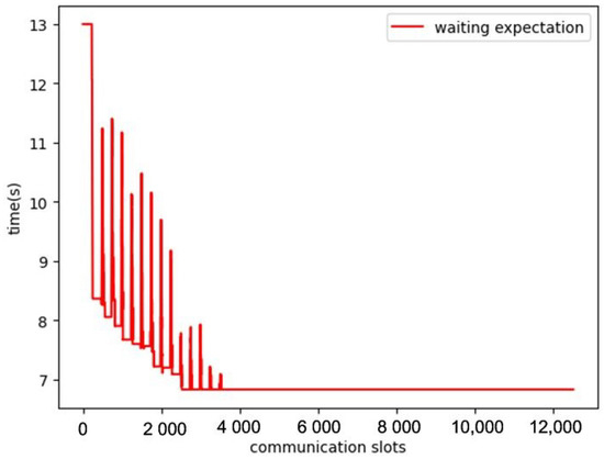 As a result, from Figure 10, we notice that the average expected wait keeps dropping and finally converges to a relatively small value. In Figure 11, we show the final slots occupied by a sub-network consisting of Node 19 and its neighbors. We see that Node 19 has does not have all of its slots occupied by either its first-order neighbors or by its second-order neighbors. There are no slots occupied by more than one of its first-order neighbors, so collision will not occur among the first-order neighbors. In some cases, a slot is occupied by a first-order neighbor or more than one second-order neighbor. For example, Slot 7 is occupied by Node 7 (i.e., a second-order neighbor of Node 19) and Node 24 (i.e., a first-order neighbor of Node 19) at the same time. This is reasonable because Node 7 and Node 24 are neither first-order neighbors nor second-order neighbors, and this will not cause communication collision.