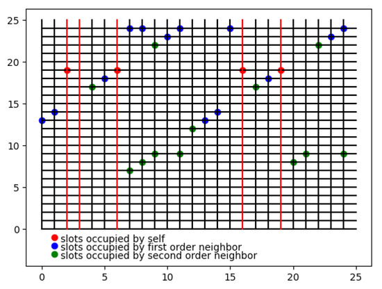 The final situation of slots occupied in the sub-network centered by Node 19. The horizontal direction denotes the IDs of slots, while the vertical direction indicates the IDs of nodes. The red dots represent slots occupied by Node 19. The blue dots indicate slots occupied by first-order neighbors of Node 19, and the green dots second-order neighbors. From the red line, it is obvious that the slots occupied by Node 19 are not occupied by any of its first- or second-order neighbors, and thus communication collisions will not occur when Node 19 speaks. Meanwhile, all slots have already been occupied by at least one node, indicating that Node 19 has already occupied all available slots.