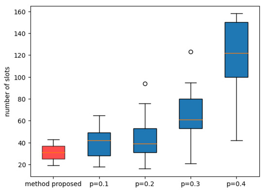 We compare the performance of our forwarding guide with that of the classic Aloha protocol. For our forwarding guide, the communication table is the one generated in Section 6.1. According to the analysis of the slot distributor, the communication table finally generated features each node occupying at least one slot. Thus, the exchanging of information by other nodes will not bother the transmission of the message packet from Node 24. However, for the classic Aloha protocol, if other nodes do not need to exchange information, they can keep silent. As we assume nodes always need to exchange information, we set each node with the same probability of broadcasting a message. As the time for message propagation is related to the probability of a node sending a message packet at a slot, we test the situation with sending probability . For each setting, we repeat the experiment 20 times. The result is shown in Figure 14.