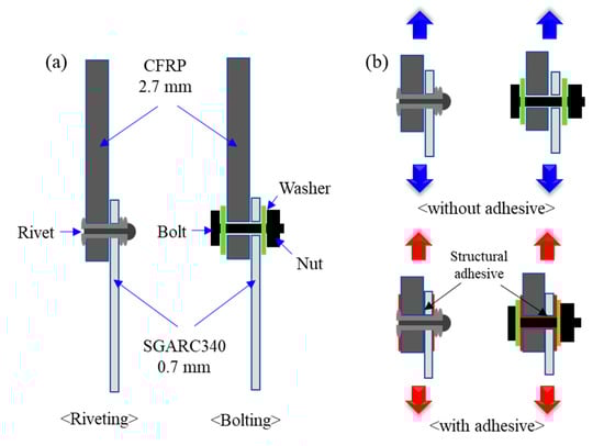Schematic of the mechanical bonding between CFRP and steel plates: (a) riveting/bolting and (b) hybrid mechanical bonding with adhesive.