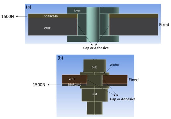 To examine the effect of the adhesive, a model with the adhesive and a model with empty space instead of the adhesive were used. Moreover, in the case of bolts, a model without the washer was developed to examine the effect of the washer. The parameters of materials used for each analysis are listed in Table 2. In all simulation cases, the boundary conditions were set such that one side of the CFRP was fixed and one side of the steel was pulled with a force of 1500 N. Next, the stress exerted on the fasteners was examined.