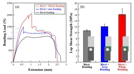 LSS results of CFRP/steel composites using riveting: (a) Load-extension graph and (b) LSS results in each case.