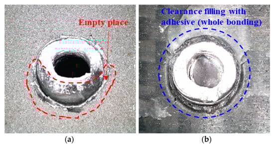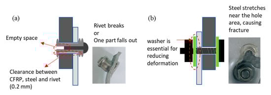 Figure 7 shows the problems that may occur during mechanical fastening between the CFRP and metal. As shown in Figure 7a, the blind rivet is a mechanical fastener that applies a bonding force to two or more different parts. It can advantageously fix the two base materials relatively easily, but an empty space inevitably exists between the rivet and hole. Moreover, the fracture of the joined dissimilar material mainly occurs in the rivet due to its weak strength. As the rivet breaks easily, the effect of the initial inclination of the rivet caused by the clearance is more critical to bonding strength than bolting. This phenomenon may cause one part to fall out, as shown in Figure 7a. The hole in the materials is pushed towards the fastener by the external force, causing the hole to gain an oval shape; moreover, the diameter increases. In this case, one part may sometimes be missing, as shown in Figure 7a. Therefore, filling the clearance with an adhesive in riveting effectively improves the clamping force compared to that in bolting. Figure 7b displays deformation behavior with bolts. Figure 5 and Figure 6 demonstrate that the washers and structural adhesive are important. In bolting, the final fracture does not occur in the bolt but rather in the steel. Consequently, filling the clearance with the adhesive is less effective than riveting. However, after minimizing the deformation of the steel with a washer, the washer prevents the initial bolt from tilting and clearly improves the adhesive strength. In this experiment, the mechanical fastening strength was observed based on the failure when using a metal with a tensile strength lower than that of CFRP. When the metal elongates easily, it deforms easily due to the initial inclination of the bolt. The washer prevents the deformation of these metals, and filling the clearance with the adhesive helps in preventing the initial tilting of bolt.