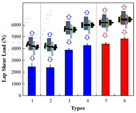 Figure 5 shows the results of evaluating the adhesive load according to the use of washer and structural adhesive when CFRP and steel were bonded by bolting. Type 1 denotes the case in which only bolts and nuts were used. The maximum lap shear load was approximately 2400 N, which was relatively low compared with other cases. However, the maximum lap shear load significantly increased to approximately 4200 N when the washer was used for both the bolt and nut (Type 4). Since the inclination of the bolt was constant when no adhesive was used, the strength improved because the deflection of the bolt decreased under the influence of the washer. Unlike riveting, in all cases of bolting, the adhesive strength was determined by the fracture of the steel. Therefore, the reduction in the deflection of the bolt prevented bending of the steel and minimized the pre-tension on the outer surface of the steel that resulted from bending; consequently, the bonding strength increased. When the washer was used on only one side as in Types 2 and 3, unlike the case in which the bolt and nut were used on both sides, the effect of preventing the bolt from bending reduced; consequently, the maximum lap shear load was lower than that when the washer was used on both sides. In particular, when a washer was used only on the bolt side, it had a significantly lower strength than when a washer was used on the nut side because the steel broke at the nut side; therefore, bending of the steel could be minimized by using a washer on the nut side. Consequently, the washer effectively prevented the bending of the bolt even if it was already tilted by the clearance.