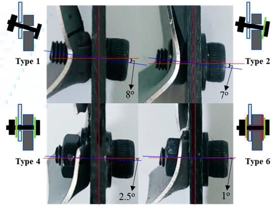 In addition, the structural adhesive was used to investigate the change in adhesive strength according to the initial inclination of the bolt when all washers were applied. The red bar in Figure 5 shows its location. When only washers were fixed using the structural adhesive (Type 5), they showcased a similar level of maximum lap shear load with a slight increase of 100 N compared to Type 4 (without the structural adhesive). Therefore, no special effect was observed upon attaching the washer to the adhesive surface. However, the highest maximum lap shear load (4800 N) was obtained when the structural adhesive was used on the washer bonding and entire-bolt contact surfaces (Type 6). In Type 6, the clearance between the bolt and hole was filled with adhesive. Compared to the case in which only the bolts and nuts were used, the maximum shear load was approximately doubled. In other words, in mechanical fastening by bolting the CFRP and steel, the washer prevents bending of the steel, and the adhesive prevents the initial inclination of the bolt. This improves the mechanical fastening strength between the CFRP and steel. Figure 6 shows a photograph captured after an LSS test of different specimens according to the use of the washer and adhesive during bolting. It shows the angle change during deformation of the bolt thread based on the vertical and horizontal lines. When only the nuts and bolts were used as in Type 1, the largest angle change was observed compared to other cases. In Type 2, where a washer was used only on the bolt side, deformation of the bolt thread was slightly alleviated due to the effect of the bolt-side washer. However, the steel showcased a deformation similar to that observed in Type 1. This reconfirms that if there is no washer on the nut side, the metal can be significantly deformed. However, the thread deformation angles of Types 4 and 6 were 2.5° and 1°, respectively, which are the minimum levels in the LSS tests. In Type 4, bending of the steel was minimized by preventing the deformation of the bolt under the influence of the washer. In Type 6, in addition to the aforementioned reason, the deformation of bolt and steel was more effectively restricted by preventing the initial inclination of bolts through structural adhesives.