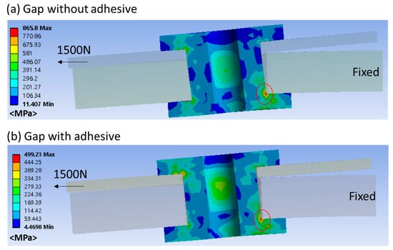 An important condition identified by the aforementioned LSS tests of riveting and bolting is the filling of clearance that occurs during mechanical fastening. The effect of the initial inclination of the fastener due to the clearance on the deformation of the rivets and bolts was investigated through numerical analysis. Figure 8 shows the stress distribution of the rivet under an external force of 1500 N. In both cases, the highest stress was applied at the rivet end where the CFRP is located, which was consistent with the area where fracture occurred in the experiment. Note that the maximum stress in Figure 8a, in which the clearance was empty, was 866 MPa, whereas in Figure 8b, in which the clearance was filled with the adhesive, the maximum stress was 499 MPa, which shows that the stress on the rivet was reduced by 42% by using the adhesive. This is because the rivet was tilted by the clearance, and the stress at the edge significantly increased by the external force. Figure 8 also shows that the clearance being filled with structural adhesive to prevent the rivet from tilting can reduce the stress at the corner where the maximum stress is applied. Figure 9 shows the analytical results of the stress distribution on the bolt when an external force of 1500 N was applied. A comparison of Figure 9a,b confirms the effect of the washer in reducing the force exerted on the bolt. Figure 9b shows that the stress exerted on the bolt was reduced by distributing the stress using the washer; consequently, the deformation of the bolt was reduced even when the same external force was applied.