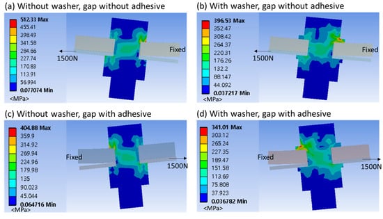 Figure 9c,d display the numerical analysis results when the structural adhesive was filled in the clearance without and with a washer, respectively. Figure 9c confirms the effect of preventing the bolt from tilting. Compared to the case in Figure 9a, the maximum stress applied to the bolt head reduced by approximately 20%. This result is similar to the case of using the washer. Figure 9d shows that the maximum stress exerted on the bolt reduced by 10% compared to that shown in Figure 9b. This indicates that even when the washer is used, the stress applied to the bolt can be reduced by preventing the bolt from tilting by filling the clearance. These results are consistent with the experimental results summarized in Section 3.1.