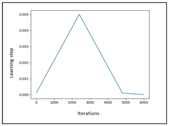 To achieve objective results, it is important to maintain a standardized training process. In the field of machine learning, even small changes can dramatically determine or change the result. For equal initialization of weights, we used Xavier’s algorithm [67,68,69]. It led us to fix a random seed so we could use the same model with the exact same initialization weights for different experiments. We did not limit or fix how long learning can last because the model might have different architectures. The only limitation we set was the verification algorithm that counts the duration of learning; the main reason was that it halts learning if the model has not improved in the previous ten iterations. Besides that, we used the SGD optimizer [70] with acceleration, and a cyclic learning step with warm-up was used for training purposes. For the first 1000 iterations, the model learns with a fixed learning step of 1 × 10−4 and then gradually increases to 5 × 10−3 over 2400 iterations and descends to 5 × 10−5 over 3600 iterations, shown in Figure 1. Warm-up applies only to the first epoch. The total number of iterations per epoch that we used was 6000, while the batch size was 64.