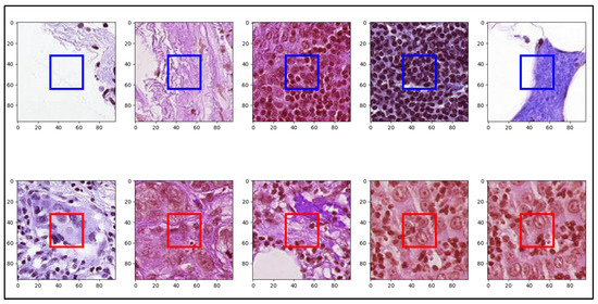 Random samples of the PatchCamelyon dataset that are stained with hematoxylin-eosin (H&E), blue (healthy tissue) and red squares (cancerous tissue) showing central regions.