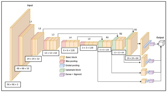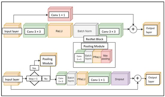 By default, U-Net networks form a complete U-shape—they transmit the entire input signal to the output of the model, which is applicable in this work due to efficiency and the type of task itself. Higher resolution output is usually used for image reproduction or segmentation tasks. In this research, classification was performed from low-resolution images, so the high-resolution output will not be superior. The following changes were made to the intermediate modules of the network structure, that we will call the E-Module, shown in Figure 5. Compared to the commonly used standard ResNet module, the E module was more efficient and faster—two 3 × 3 convolutions were changed to one compressed 3 × 3 convolution and one 1 × 1 convolution, with the same number of channels as the number of input layer channels. Furthermore, the typical ReLU (rectified linear unit) activation was changed to PReLU (parametric rectified linear unit) [75]. In this way, the model will be able to apply the best activation for each layer according to the direction of the gradient. Together with this activation function, it was possible to see the behavior of the model by analyzing the values of the activation coefficients. Finally, a Dropout layer was added at the end of the module, which performs a dual regularization: it reduces the signal bandwidth and allows the dropout factor to be increased to 1 at the end of training to discard supposedly unnecessary parts of the model.