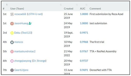 In addition to that, we added the TTA [79,80] method, as the training data were adjusted very flexibly—we selected certain featuring: color channel change, vertical flip, horizontal flip, rotate −90 degrees, rotate +90 degrees, lighten the image by 5%, darken the image by 25%; unfortunately, the individually processed images results gained only 0.9590 AUC.
