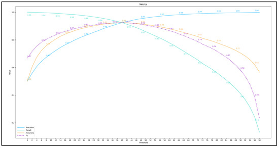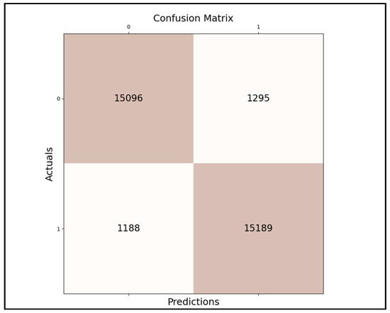 To sum up, it can be stated that artificial neural networks are able to distinguish tissue areas affected by cancer quite well. The developed MS-model is more accurate and faster than most of the models presented in the “Patch Chameleon” standings as shown in Figure 6. It can be said that such accuracy was most influenced by the effective architecture of the neural network and research on combining and assembling models. As shown in Figure 7, we have reached a maximum F1 score of 0.924 with a threshold of 0.393; this score measured on our last best model’s accuracy (that is evaluated from precision and recall), as long as the confusion matrix is that shown in Figure 8, giving us a result of meaning how many times our best model gave us correct predictions: true positives—15,096, true negatives—15,189, false negatives—1295, and false positives—1188. According to experiments, even with less-than-ideally prepared training data, the last ensemble method managed to exceed 0.9691 AUC.