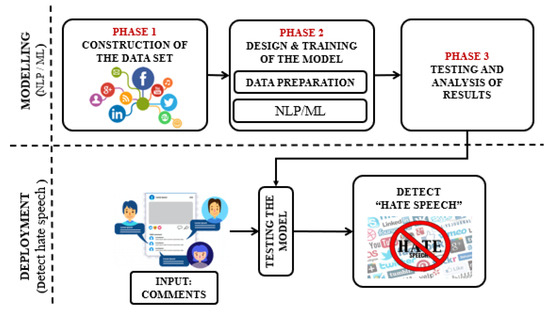 - Phase 1: Construction of the data set. We firstly selected and gathered relevant data for our analysis, which was used to train and validate our proposal. We used scraping techniques to gather comments from different types of social media posts (newspaper, social media networks, video platforms, etc.). Part of the data was labeled, to train the system, as detailed in Section 4