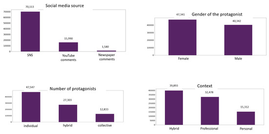 In order to avoid an unbalanced training data set, we selected comments from approximately one third of each type of social media source (posts/hashtags, videos, and pieces of news). Besides that, we selected comments that assured a balanced representation of the gender of the protagonist (half of each), number of protagonists (one third of each), and context (one third of each). At the end, we obtained 4389 balanced comments, approximately 5% of the global data set.