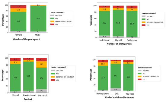 After that, we analyzed how the sexist comments were distributed in the training data set (manually labeled), according to the same characteristics (Figure 3). When the content source was about women (individual and/or collective) there was a relevant percentage of sexist comments () or comments that might be sexist (). However, when the content source was about men (individual and/or collective) there is a residual percentage of sexist comments () or comments that might be sexist (). These results reinforce other previous analyses, that stated women are mainly the object of sexist attacks on digital media [1,2]. The number of protagonists in the content source is not relevant for this study, since the percentage of sexist comments are quite balanced among the three categories: individual , collective , hybrid . However, this result changes when we focus on the context of the content source: personal content obtains the highest percentage ( of sexist comments and of potential sexist comments) versus professional content ( of sexist comments and of potential sexist comments). Finally, the type of source is also important: comments in the digital newspaper were more sexist ( and of potentially sexists) than on Twitter ( and of potentially sexists) or on YouTube ( and of potentially sexists). This is especially remarkable, since the number of comments in the newspapers was the lowest (only ).