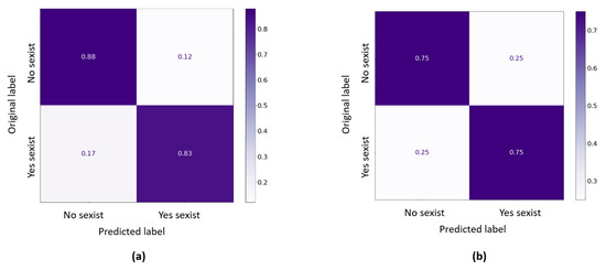 After training the model, we assessed the performance of the anti-sexism alert system on the training data set and on the test data set. The obtained results are summarized in the precision, recall, and F1 scores of Table 2 and Table 3, and the confusion matrices of Figure 4. These show the percentage of sexist/non-sexist comments correctly and incorrectly identified, in (a) the training data set, and (b) the test data set. As expected, the performance of the algorithm worsens when it has to classify the test set, composed of comments that have not been used in the training.