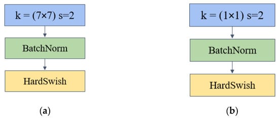 As shown in Figure 2, the ConvBN convolution block consists of a convolutional layer with a step number of 2 and a convolutional kernel size of 7 × 7, plus a BatchNorm layer with the activation function HardSwish. convBN 1 × 1 convolution is similar to ConvBN in that the convolutional layer uses 1 × 1 convolution for channel up-dimensioning and down-dimensioning. The convolutional kernel in ConvBN has a larger sensory field to extract more image information. BathNorm is a batch normalization operation that reduces the dependence of the model on the initial parameters and accelerates the network’s training and model generalization ability. In the design of the inverted bottleneck module, two models are used, including the maximum pooling layer (called IBMax) and without (called IB). The following figure shows the structure of the two modules.