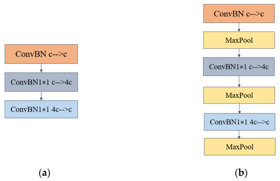 In the two inverted bottleneck introductory modules, the number of input and output channels of ConBN is c. The middle ConvBN1 × 1 and the third layer ConvBN1 × 1 channel up-dimensioning and down-dimensioning, respectively, and the up-dimensioning convolution changes the number of channels to four times the original one and then down-dimensioning back to c, Please refer to Figure 3 for detailed information and specifics. In the inverted bottleneck primary module with Maxpool, the changing pattern of the number of channels is the same as in Figure 4a.