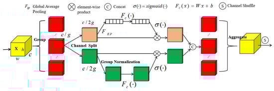 For traditional convolutional networks, the spatial localization ability of the network is poor, i.e., the network cannot locate the leaf disease region well and learn the disease features during the recognition process. Shuffle Attention is one of the attention mechanisms, the core idea of which is to focus on the picture’s critical information [32]. The following Figure 5 shows the structure schematic of the Shuffle Attention module: