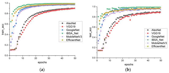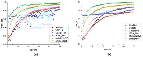 In Figure 9a,b, the performance of six models on the PDDA dataset is evaluated. The results demonstrate that the training and testing accuracies of all models have decreased compared to those of PlantVillage. This decline in accuracy may be due to the greater complexity of the backgrounds in the PDDA dataset. However, IBSA_Net remains the best-performing model, indicating its ability to remain less influenced by complex backgrounds and display stronger robustness than the other models.