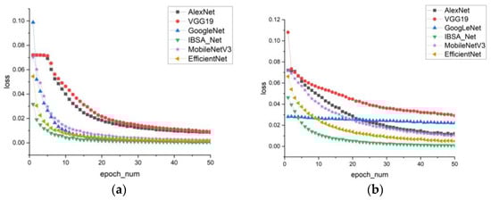 In this study, the performance of the PlantVillage model group was analyzed in terms of training and testing. The recognition accuracy of six models was evaluated using the accuracy curve shown in Figure 8a,b. The findings revealed that the IBSA_Net model outperformed the other models, exhibiting significantly higher recognition accuracy in the early stages of training. As the training progressed, the accuracy curve of IBSA_Net tended to flatten after eth 10th round, indicating a convergence effect. After 50 rounds of training, the IBSA_Net model achieved a training accuracy of 99.7% and a testing accuracy of 99.4%. While the EfficientNet and MobileNetV3 models showed similar training accuracy to IBSA_Net in eth 50th round, at 98.4% and 97.6%, respectively, the training and testing accuracy gaps of models other than IBSA_Net were over 2%. These findings suggest that these models suffer from overfitting problems and display weaker generalization ability than the IBSA_Net model.