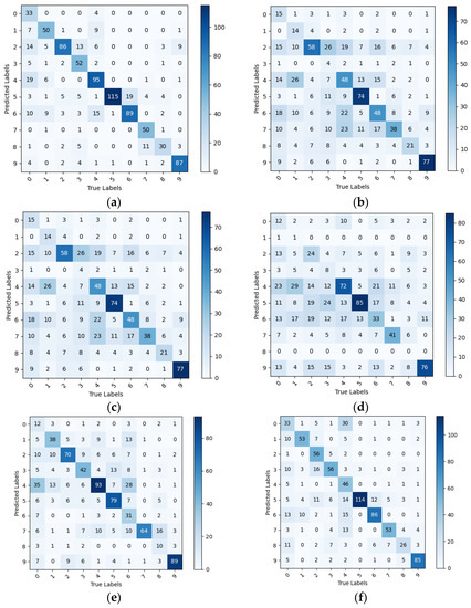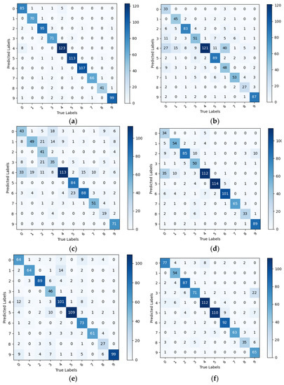 Confusion matrix for PDDA model clusters tested on PlantDoc++, (a) IBSA_Net (b) AlexNet (c) VGG (d) GoogLeNet (e)MobileNetV3 (f) EfficientNet.