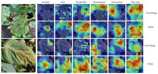In order to better understand how convolutional neural networks identify diseases in different parts of the images during training, this paper utilizes the Grad-CAM attention visualization tool to generate attention heat maps of the network’s predictions [34,35]. The heat map highlights important regions by color-coding them, where redder and warmer colors correspond to regions of greater importance that the network is most interested in, while cooler colors (bluish) denote regions of less interest. Attention visualizations were obtained for some diseased leaves, and the corresponding heat maps are shown in Figure 13. From the heat maps, we can observe that within the PlantVillage model cluster, the red areas of the three models, except IBSA_Net, are small and scattered. In contrast, the warm areas of the IBSA_Net network are mainly concentrated around the disease spots, but the attention is not focused on the disease spot area. This indicates that the disease information learned from a single background dataset may not generalize well to more complex background datasets.