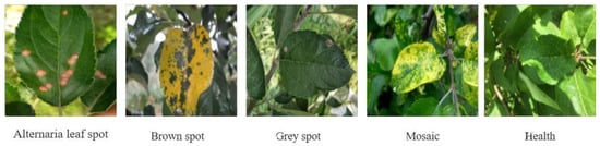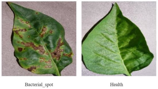 While the experiments conducted in this study primarily focused on tomato disease leaves, the feature extraction and identification capabilities of IBSA_Net can be extended to other crops. To test this, we evaluated the model’s performance on apple and chili pepper leaves, the dataset examples are shown in Figure 14 and Figure 15. The apple leaf dataset comprises five categories: Alternaria leaf spot, Brown spot, Grey spot, Mosaic, and Healthy, while the chili pepper leaf dataset consists of two categories: Bacterial spot and Healthy. These datasets were obtained from Yang’s paper and PlantVillage, respectively [37]. The datasets were split into an 8:2 ratio for training and testing, and the results are presented below.