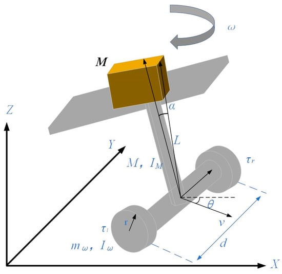 The position and posture of the WIPR in the world coordinate system are represented by . As the Lagrangian modeling method does not require the inclusion of internal forces within the system, it is a quick and straightforward method of building a model. This property makes it particularly well-suited for constructing multivariable and nonlinear dynamic models for the WIPR, as demonstrated in this paper. By dividing into and , the position of the robot in the coordinate system is denoted by , while the angle of the pendulum is represented by . Therefore, the Lagrangian method [31] is employed to establish the dynamic model of the WIPR, and the resulting mathematical model is presented below as Equation (2).