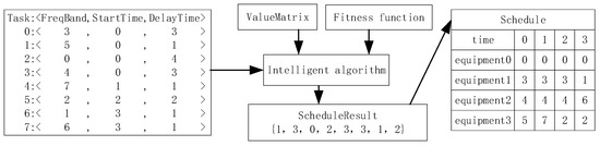 According to the value matrix, under the condition of obtaining the maximum value for the fitness function of the Schedule, the task-dynamic-scheduling result is obtained through the intelligent algorithm. The result data are the equipment-code sequence. The two-dimensional table of the Schedule is shown in Figure 2. The abscissa is the sequence code of the period, the ordinate is the sequence code of the equipment, and the data are the frequency band transmitted by the equipment during the period. For example, the number of position 0 in the result value is 1, indicating that task0 is assigned to equipement1. The frequency-band code of task0 is 3, the start time is 0, and the delay time is 3. With time from 0 to 2 in equipment1 in the Schedule, the frequency-band code is 3.