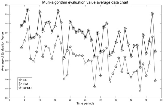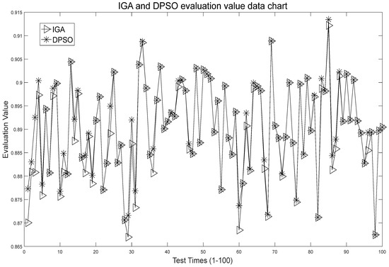 According to Table 11, the DPSO has obtained an evaluation value superior to that of the IGA, which shows that the two intelligent algorithms operate stably, and that the DPSO has obvious accuracy advantages when dealing with DSTTs. See Figure 4 for a comparison diagram.