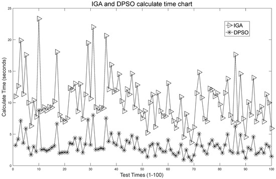 - In the simulation experiment with a maximum period of 48, in 100 experiments the average execution time of the DPSO was 3.195 s, and the average execution time of the IGA was 10.388 s. The DPSO improved the execution efficiency by 69.246%.