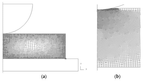 (a) Geometric set-up used for the simulation of Brinell hardness; and (b) fine mesh elements in the vicinity of an indent.
