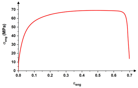The change of length with elongation during the tensile test enables the calculation of the generally used engineering stress–strain curve (Figure 4). Alternatively, the true stress–strain relation, which better reflects the real nature of deformation compared to the engineering counterparts, can be expressed in the form of the Ramberg–Osgood (R–O) model (see Figure 5). The model parameters of the R–O equation were evaluated from the pre-neck formation stage. As Figure 5 shows, the measured strain–stress diagram can be successfully reproduced by implementing Equation (2) with the fitting parameters listed in Table 2. The peak stress for both the simulated and measured curves is observed at the true strain of 0.49 and this result is consistent with the one reported elsewhere [19], while the yield stress was estimated to be 15.3 MPa.