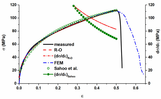 Measured and simulated true strain–stress curves for 1050 Al alloy (the scale for the dσ/dε curve is shown on the right side); R–O stands for Ramberg–Osgood model [3,4].